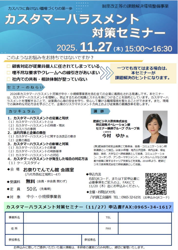 令和7年11月27日(木)15時より、おまつりでんでん館 会議室にて「カスタマーハラスメント対策セミナー」を開催いたします。