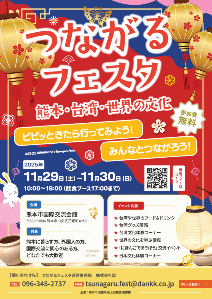 令和7年11月29日(土)~30日(日)の二日間、10時~16時に熊本市国際交流会館にて「熊本・台湾・世界の文化」についてイベントが開催されます。