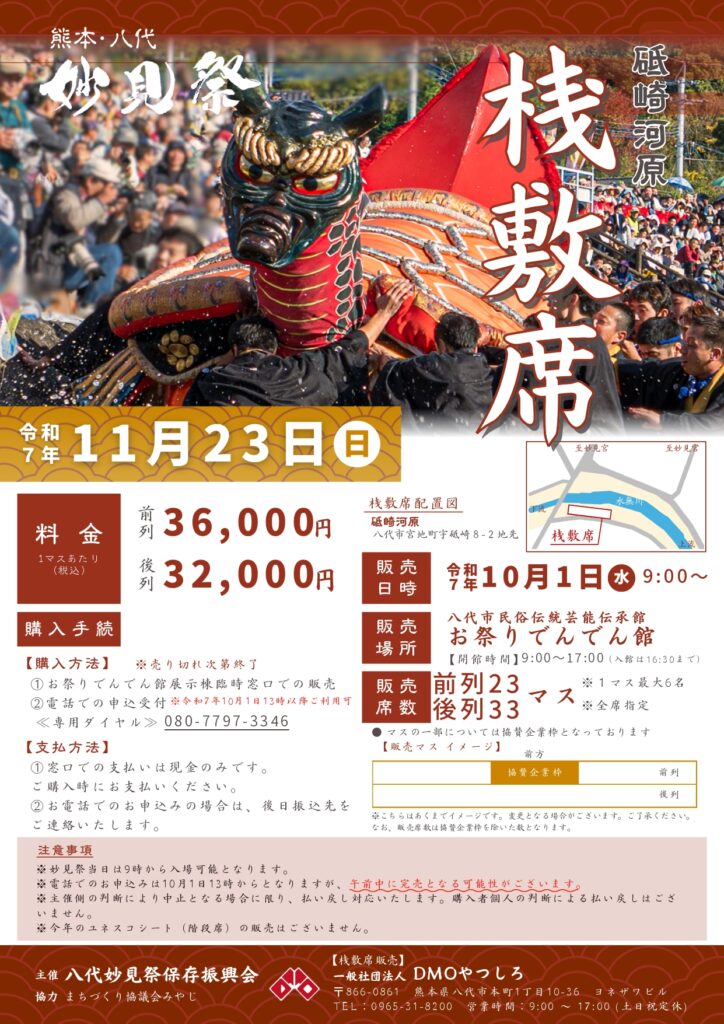 令和7年11月23日(木・祝)に開催される八代妙見祭神幸行列(お上り)の演舞を間近で見ることが出来る砥崎河原演舞場の桟敷席が販売されています!