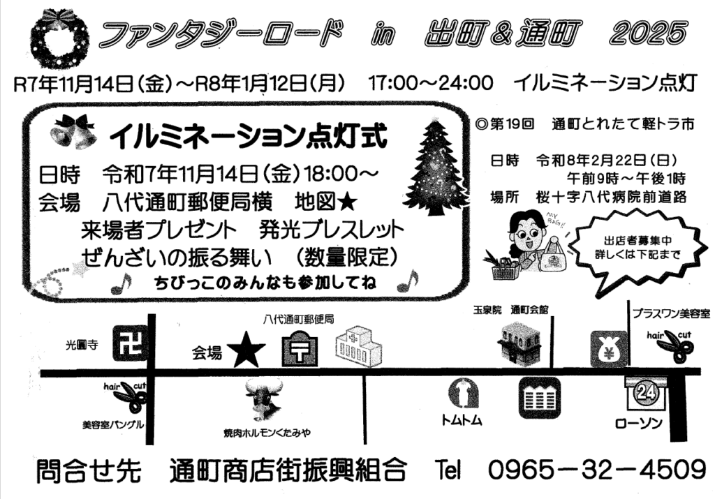 11月14日(金)18時よりイルミネーション点灯式を八代路通町郵便局横にて開催いたします。